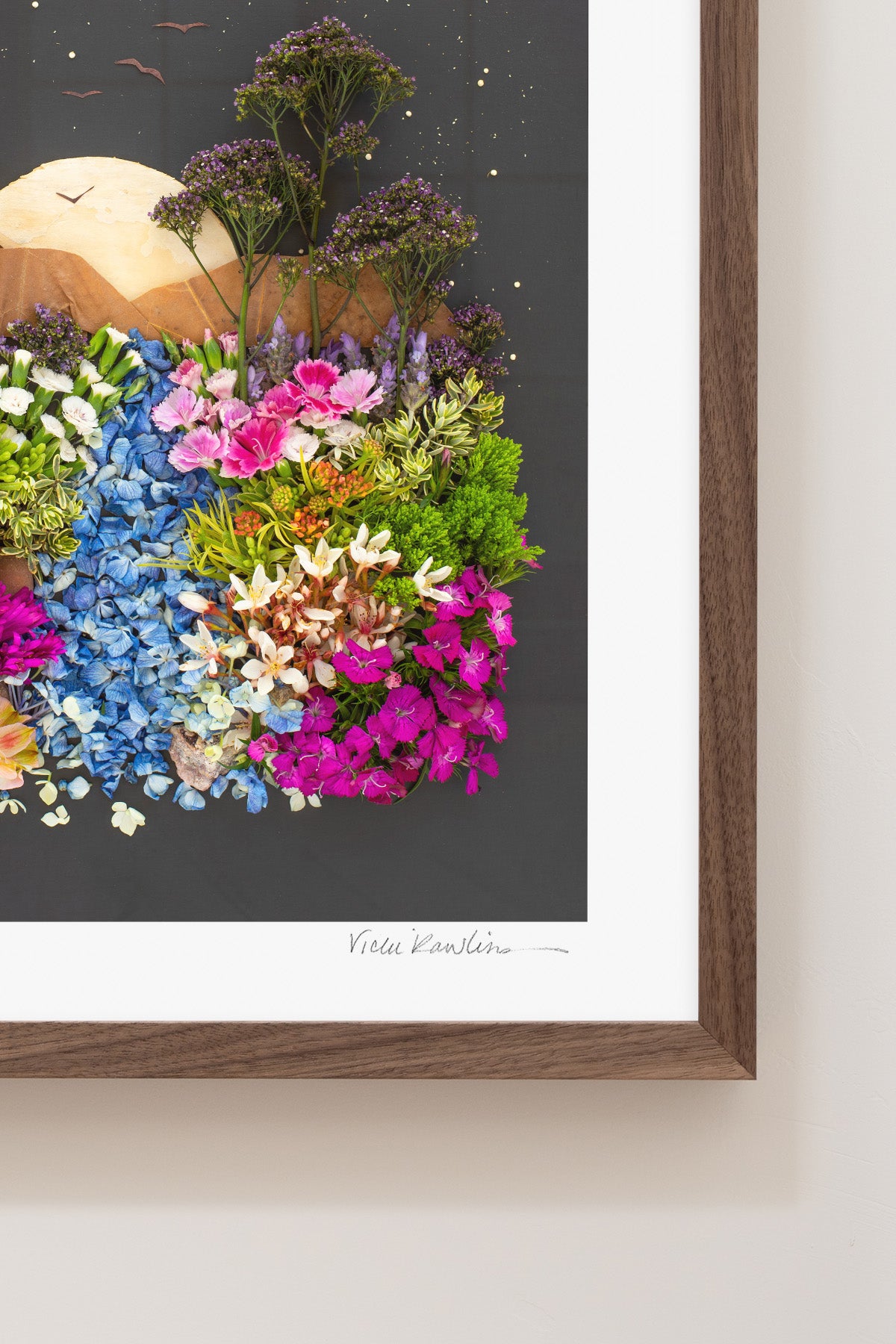 Our prints are printed on professional quality smooth matte fine art paper that is acid-free, pH-neutral and 100% cotton. Find out more about our prints here. Our frames are made of the highest quality genuine wood mouldings (no plastic) that are handcrafted and hand-joined to fit your print. Find our more about our frames here.